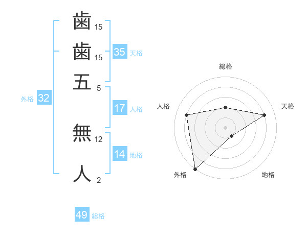 歯歯五 無人さんの総格は49画の2点!
