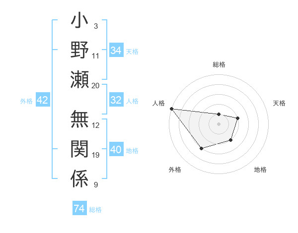 小野瀬 無関係さんの総格は74画の1点