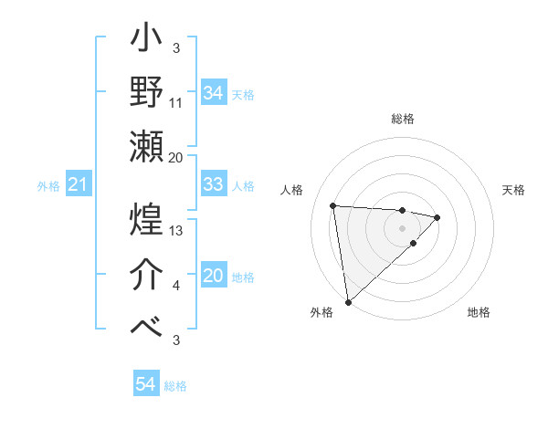 小野瀬 煌介べさんを姓名の画数から五運を鑑定
