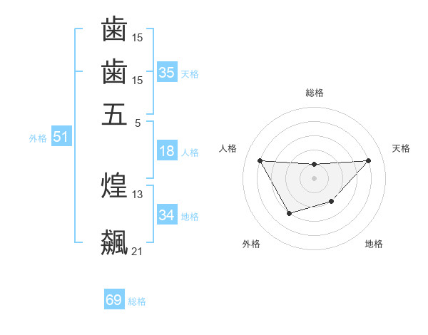 歯歯五 煌飆さんの総格は69画の1点!