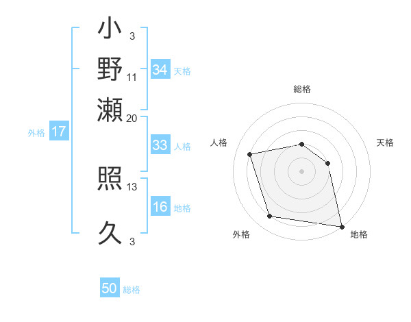 小野瀬 照久さんの総格は50画の2点!