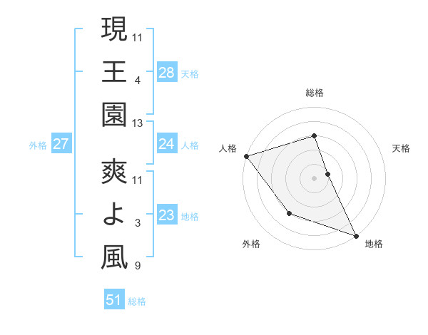現王園 爽よ風さんを姓名の画数から五運を鑑定
