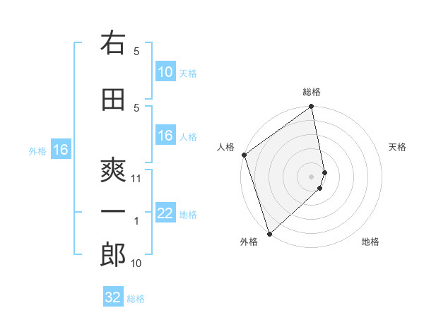 右田 爽一郎さんの総格は32画の5点!
