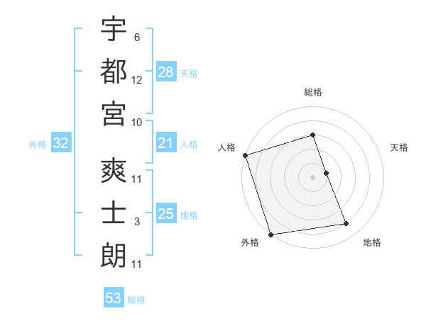 宇都宮 爽士朗さんの総格は53画の3点!