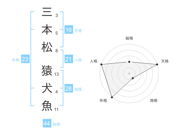 三本松 猿犬魚さんを姓名の画数から五運を鑑定