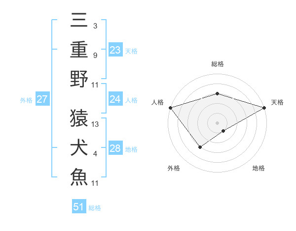 三重野 猿犬魚さんの総格は51画の3点!