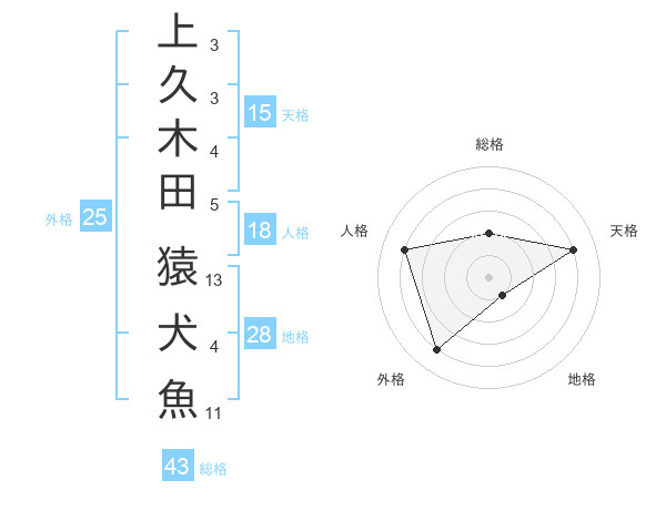 上久木田 猿犬魚さんを姓名の画数から五運を鑑定