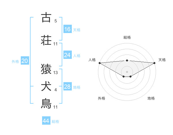 古荘 猿犬鳥さんを姓名の画数から五運を鑑定