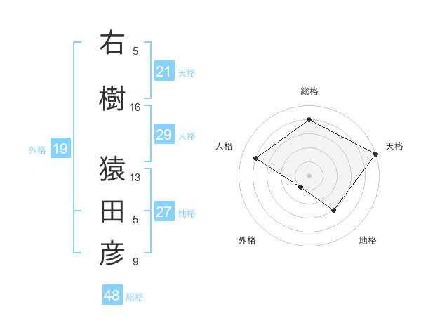 右樹 猿田彦さんの外格は19画の1点