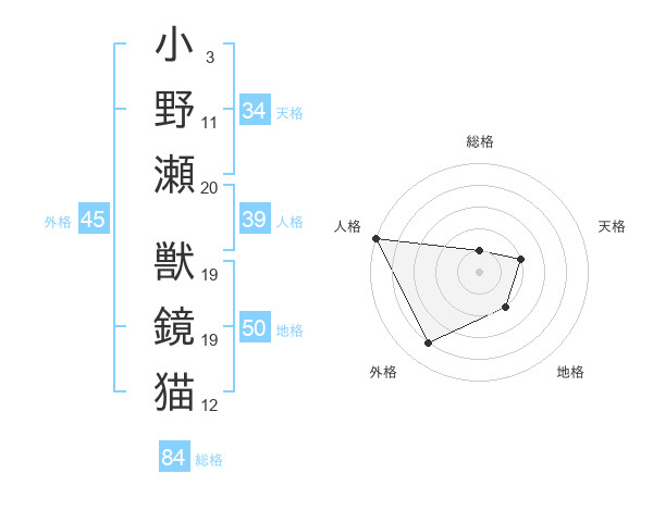 小野瀬 獣鏡猫さんの総格は84画の1点!