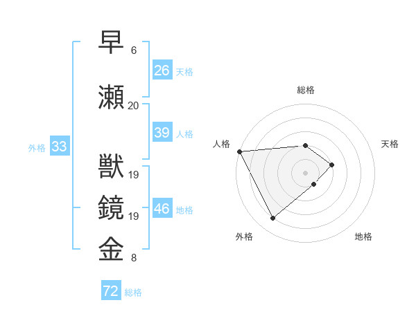 早瀬 獣鏡金さんの総格は72画の2点!