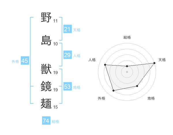 野島 獣鏡麺さんの総格は74画の1点!