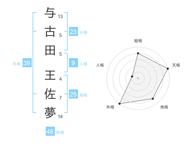 与古田 王佐夢さんの天格は23画の5点