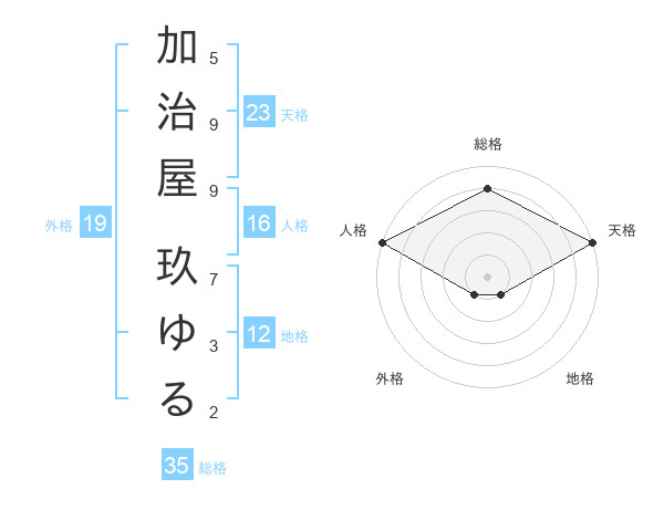 加治屋 玖ゆるさんの天格は23画の5点
