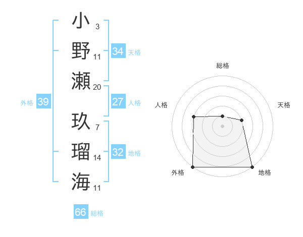 小野瀬 玖瑠海さんの外格は39画の5点!