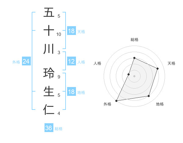 五十川 玲生仁さんの外格は24画の5点!