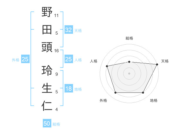 野田頭 玲生仁さんの総格は50画の2点!