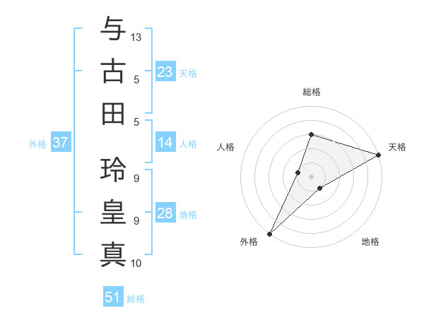 与古田 玲皇真さんの天格は23画の5点