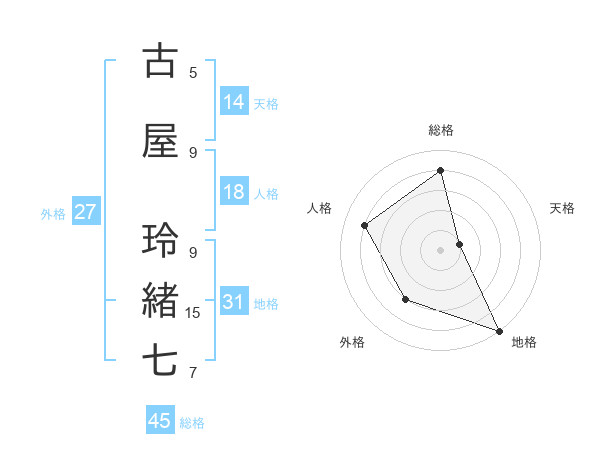 古屋 玲緒七さんの総格は45画の4点!