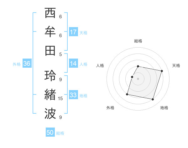 西牟田 玲緒波さんを姓名の画数から五運を鑑定