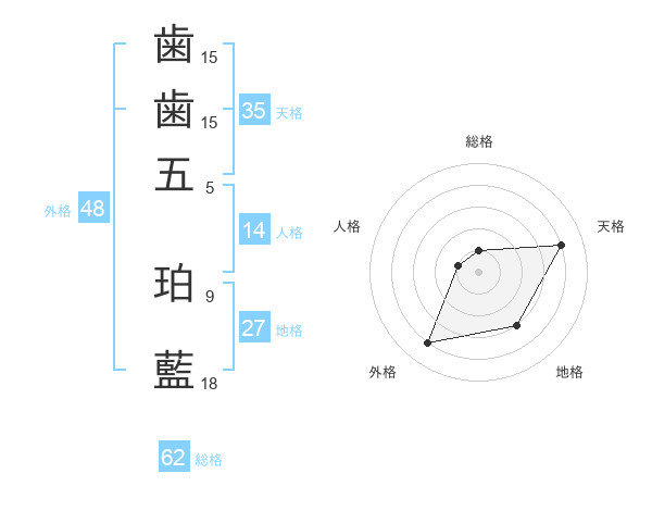 歯歯五 珀藍さんの総格は62画の1点!