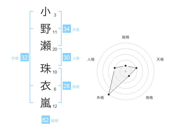 小野瀬 珠衣嵐さんの外格は32画の5点!