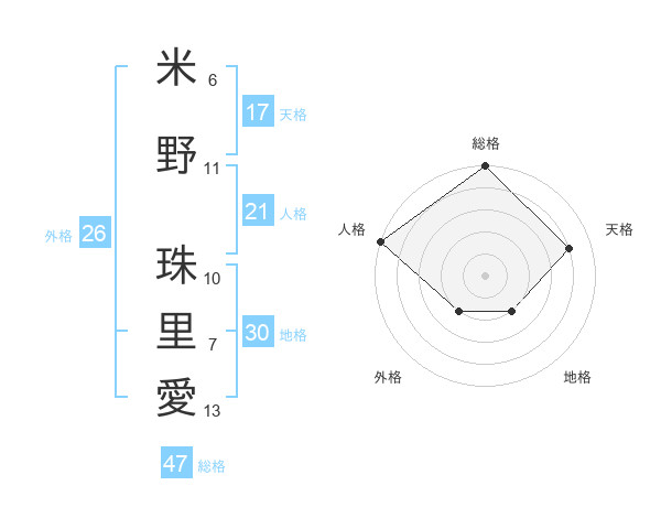 米野 珠里愛さんの総格は47画の5点