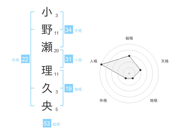 小野瀬 理久央さんの総格は53画の3点!