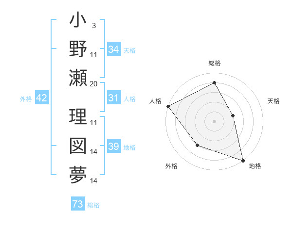 小野瀬 理図夢さんの総格は73画の4点!