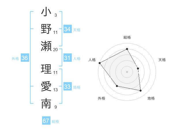 小野瀬 理愛南さんの総格は67画の4点!