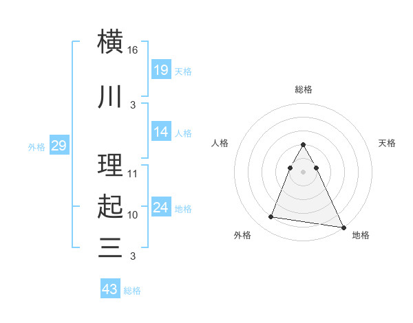 横川 理起三さんの総格は43画の2点!