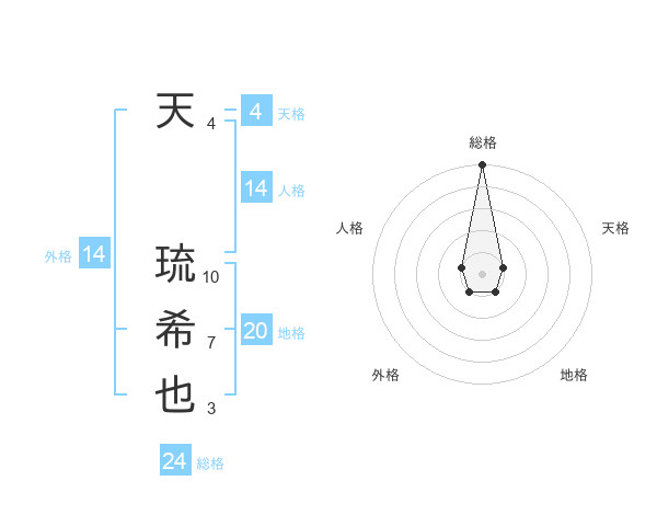 天 琉希也さんの総格は24画の5点!