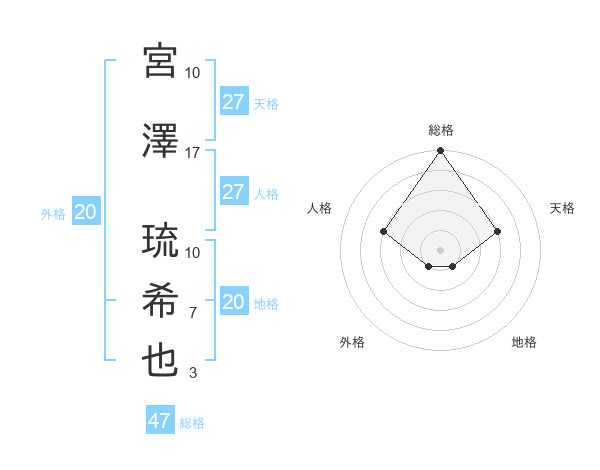 宮澤 琉希也さんの総格は47画の5点!
