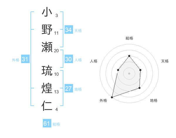 小野瀬 琉煌仁さんの総格は61画の3点