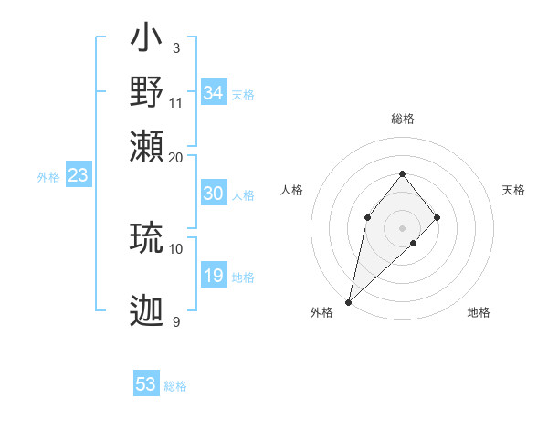 小野瀬 琉迦さんの総格は53画の3点