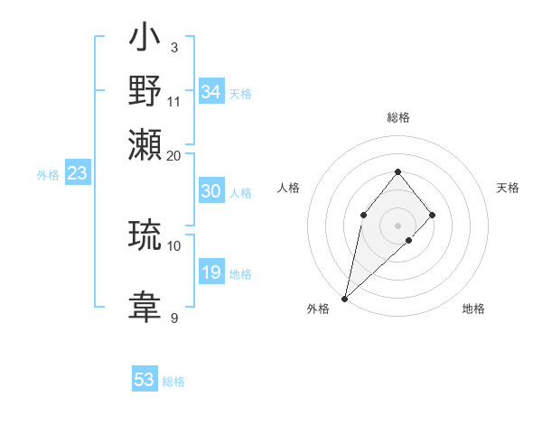 小野瀬 琉韋さんを姓名の画数から五運を鑑定