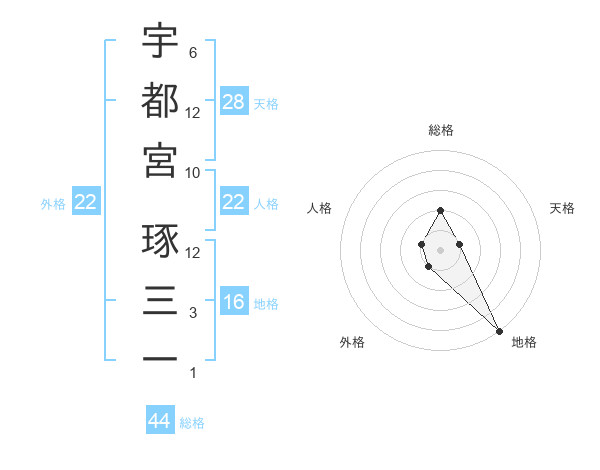 宇都宮 琢三一さんの総格は44画の2点!