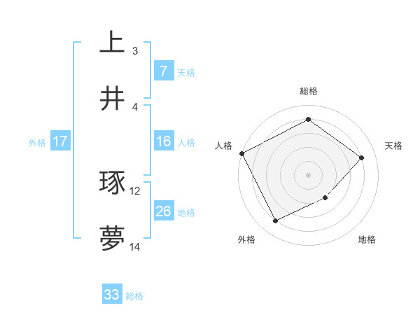 上井 琢夢さんの総格は33画の4点!