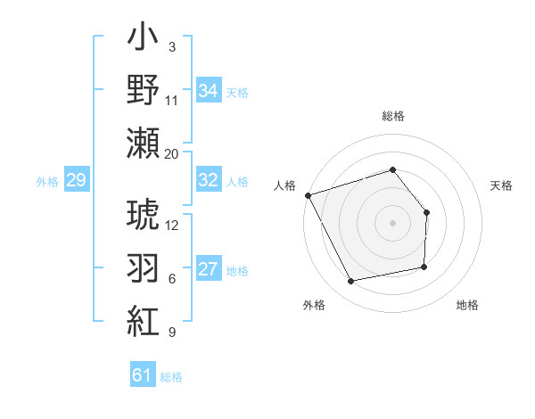 小野瀬 琥羽紅さんの総格は61画の3点!