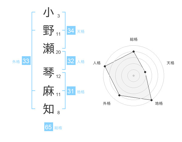小野瀬 琴麻知さんの総格は65画の4点