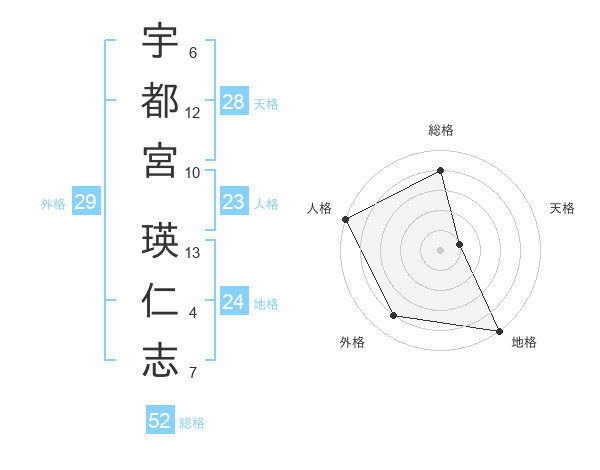 宇都宮 瑛仁志さんの総格は52画の4点!