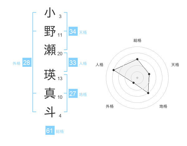 小野瀬 瑛真斗さんの総格は61画の3点!
