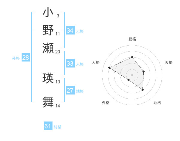 小野瀬 瑛舞さんの総格は61画の3点!