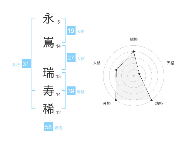 永嶌 瑞寿稀さんの外格は31画の5点!