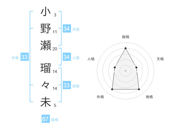 小野瀬 瑠々未さんの総格は67画の4点!