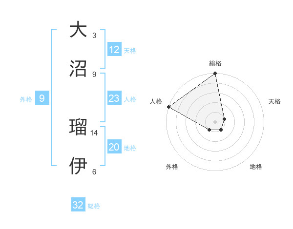 大沼 瑠伊さんの総格は32画の5点!