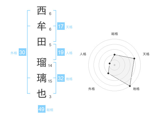 西牟田 瑠璃也さんの天格は17画の4点!