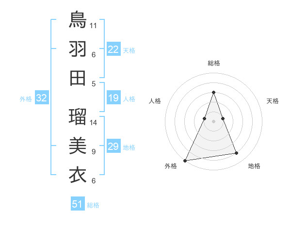 鳥羽田 瑠美衣さんの総格は51画の3点!