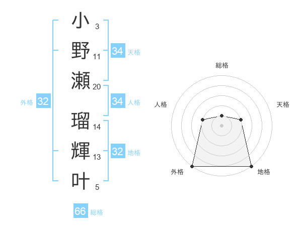 小野瀬 瑠輝叶さんの総格は66画の1点!
