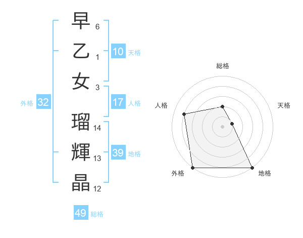 早乙女 瑠輝晶さんの地格は39画の5点!